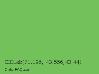 CIELab 71.196,-43.556,43.44 Color is a normal green color and the nearest color is Mantis #74c365. Hex code #72c15b and RGB value is rgb(114,193,91). In RGB color space, this color is composed of 45% red, 76% green, 36% blue, In CMYK color space, this color is composed of 41% cyan, 0% magenta, 53% yellow , 24% black , In HSL color space, this color has a hue angle of 106° , 45% saturation and 56% lightness.