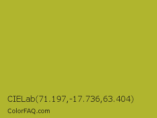 CIELab 71.197,-17.736,63.404 Color is a normal yellow color and the nearest color is Acid Green #b0bf1a. Hex code #b0b52e and RGB value is rgb(176,181,46). In RGB color space, this color is composed of 69% red, 71% green, 18% blue, In CMYK color space, this color is composed of 3% cyan, 0% magenta, 75% yellow , 29% black , In HSL color space, this color has a hue angle of 62° , 59% saturation and 45% lightness.