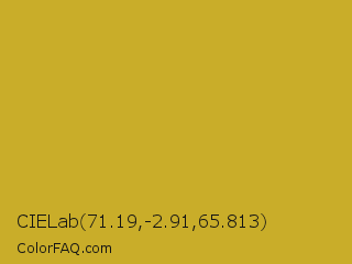CIELab 71.19,-2.91,65.813 Color is a normal yellow color and the nearest color is Hokey Pokey #c8a528. Hex code #c9ad29 and RGB value is rgb(201,173,41). In RGB color space, this color is composed of 79% red, 68% green, 16% blue, In CMYK color space, this color is composed of 0% cyan, 14% magenta, 80% yellow , 21% black , In HSL color space, this color has a hue angle of 50° , 66% saturation and 47% lightness.