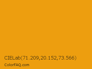 CIELab 71.209,20.152,73.566 Color is a normal orange color and the nearest color is Gamboge #e49b0f. Hex code #ed9e0f and RGB value is rgb(237,158,15). In RGB color space, this color is composed of 93% red, 62% green, 6% blue, In CMYK color space, this color is composed of 0% cyan, 33% magenta, 94% yellow , 7% black , In HSL color space, this color has a hue angle of 39° , 88% saturation and 49% lightness.