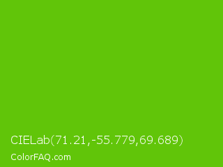 CIELab 71.21,-55.779,69.689 Color is a normal green color and the nearest color is Lima #76bd17. Hex code #61c509 and RGB value is rgb(97,197,9). In RGB color space, this color is composed of 38% red, 77% green, 4% blue, In CMYK color space, this color is composed of 51% cyan, 0% magenta, 95% yellow , 23% black , In HSL color space, this color has a hue angle of 92° , 91% saturation and 40% lightness.