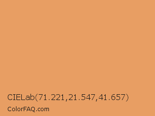 CIELab 71.221,21.547,41.657 Color is a light orange color and the nearest color is Earth Yellow #e1a95f. Hex code #e89e63 and RGB value is rgb(232,158,99). In RGB color space, this color is composed of 91% red, 62% green, 39% blue, In CMYK color space, this color is composed of 0% cyan, 32% magenta, 57% yellow , 9% black , In HSL color space, this color has a hue angle of 27° , 74% saturation and 65% lightness.