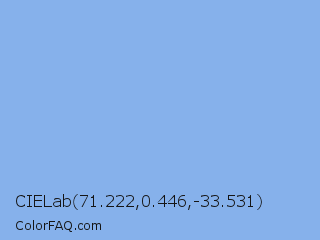 CIELab 71.222,0.446,-33.531 Color is a light blue color and the nearest color is Jordy Blue #8ab9f1. Hex code #86b1eb and RGB value is rgb(134,177,235). In RGB color space, this color is composed of 53% red, 69% green, 92% blue, In CMYK color space, this color is composed of 43% cyan, 25% magenta, 0% yellow , 8% black , In HSL color space, this color has a hue angle of 214° , 72% saturation and 72% lightness.