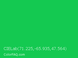 CIELab 71.225,-65.935,47.564 Color is a normal green color and the nearest color is Malachite #0bda51. Hex code #14c951 and RGB value is rgb(20,201,81). In RGB color space, this color is composed of 8% red, 79% green, 32% blue, In CMYK color space, this color is composed of 90% cyan, 0% magenta, 60% yellow , 21% black , In HSL color space, this color has a hue angle of 140° , 82% saturation and 43% lightness.