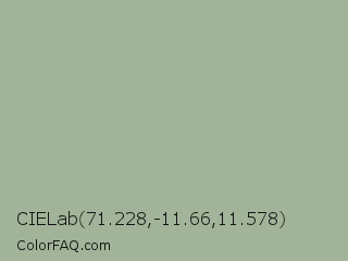 CIELab 71.228,-11.66,11.578 Color is a light green color and the nearest color is Schist #a9b497. Hex code #a1b499 and RGB value is rgb(161,180,153). In RGB color space, this color is composed of 63% red, 71% green, 60% blue, In CMYK color space, this color is composed of 11% cyan, 0% magenta, 15% yellow , 29% black , In HSL color space, this color has a hue angle of 102° , 15% saturation and 65% lightness.