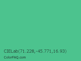 CIELab 71.228,-45.771,16.93 Color is a normal green color and the nearest color is Ocean Green #48bf91. Hex code #4cc38e and RGB value is rgb(76,195,142). In RGB color space, this color is composed of 30% red, 76% green, 56% blue, In CMYK color space, this color is composed of 61% cyan, 0% magenta, 27% yellow , 24% black , In HSL color space, this color has a hue angle of 153° , 50% saturation and 53% lightness.