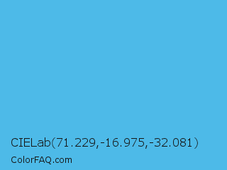 CIELab 71.229,-16.975,-32.081 Color is a light blue color and the nearest color is Picton Blue #45b1e8. Hex code #4dbae8 and RGB value is rgb(77,186,232). In RGB color space, this color is composed of 30% red, 73% green, 91% blue, In CMYK color space, this color is composed of 67% cyan, 20% magenta, 0% yellow , 9% black , In HSL color space, this color has a hue angle of 198° , 77% saturation and 61% lightness.
