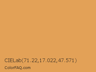 CIELab 71.22,17.022,47.571 Color is a light orange color and the nearest color is Indian Yellow #e3a857. Hex code #e3a157 and RGB value is rgb(227,161,87). In RGB color space, this color is composed of 89% red, 63% green, 34% blue, In CMYK color space, this color is composed of 0% cyan, 29% magenta, 62% yellow , 11% black , In HSL color space, this color has a hue angle of 32° , 71% saturation and 62% lightness.