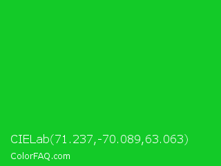 CIELab 71.237,-70.089,63.063 Color is a normal green color and the nearest color is Vivid Malachite #00cc33. Hex code #13ca28 and RGB value is rgb(19,202,40). In RGB color space, this color is composed of 7% red, 79% green, 16% blue, In CMYK color space, this color is composed of 91% cyan, 0% magenta, 80% yellow , 21% black , In HSL color space, this color has a hue angle of 127° , 83% saturation and 43% lightness.