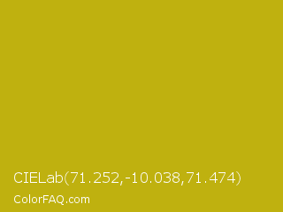 CIELab 71.252,-10.038,71.474 Color is a normal yellow color and the nearest color is Sahara #b7a214. Hex code #bfb10f and RGB value is rgb(191,177,15). In RGB color space, this color is composed of 75% red, 69% green, 6% blue, In CMYK color space, this color is composed of 0% cyan, 7% magenta, 92% yellow , 25% black , In HSL color space, this color has a hue angle of 55° , 85% saturation and 40% lightness.