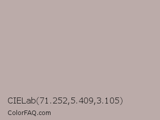 CIELab 71.252,5.409,3.105 Color is a light red color and the nearest color is Silk #bdb1a8. Hex code #bbaba9 and RGB value is rgb(187,171,169). In RGB color space, this color is composed of 73% red, 67% green, 66% blue, In CMYK color space, this color is composed of 0% cyan, 9% magenta, 10% yellow , 27% black , In HSL color space, this color has a hue angle of 7° , 12% saturation and 70% lightness.