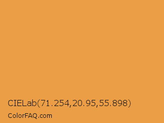 CIELab 71.254,20.95,55.898 Color is a normal orange color and the nearest color is Neon Carrot #ffa343. Hex code #eb9e46 and RGB value is rgb(235,158,70). In RGB color space, this color is composed of 92% red, 62% green, 27% blue, In CMYK color space, this color is composed of 0% cyan, 33% magenta, 70% yellow , 8% black , In HSL color space, this color has a hue angle of 32° , 80% saturation and 60% lightness.