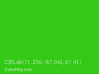 CIELab 71.256,-67.041,67.41 Color is a normal green color and the nearest color is Harlequin Green #46cb18. Hex code #34c916 and RGB value is rgb(52,201,22). In RGB color space, this color is composed of 20% red, 79% green, 9% blue, In CMYK color space, this color is composed of 74% cyan, 0% magenta, 89% yellow , 21% black , In HSL color space, this color has a hue angle of 110° , 80% saturation and 44% lightness.
