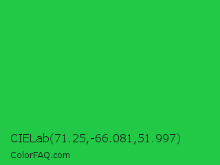 CIELab 71.25,-66.081,51.997 Color is a normal green color and the nearest color is Lime Green #32cd32. Hex code #21c947 and RGB value is rgb(33,201,71). In RGB color space, this color is composed of 13% red, 79% green, 28% blue, In CMYK color space, this color is composed of 84% cyan, 0% magenta, 65% yellow , 21% black , In HSL color space, this color has a hue angle of 134° , 72% saturation and 46% lightness.