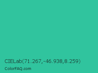 CIELab 71.267,-46.938,8.259 Color is a normal cyan color and the nearest color is Shamrock #33cc99. Hex code #30c49e and RGB value is rgb(48,196,158). In RGB color space, this color is composed of 19% red, 77% green, 62% blue, In CMYK color space, this color is composed of 76% cyan, 0% magenta, 19% yellow , 23% black , In HSL color space, this color has a hue angle of 165° , 61% saturation and 48% lightness.