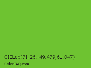CIELab 71.26,-49.479,61.047 Color is a normal green color and the nearest color is Green RYB #66b032. Hex code #6ec331 and RGB value is rgb(110,195,49). In RGB color space, this color is composed of 43% red, 76% green, 19% blue, In CMYK color space, this color is composed of 44% cyan, 0% magenta, 75% yellow , 24% black , In HSL color space, this color has a hue angle of 95° , 60% saturation and 48% lightness.