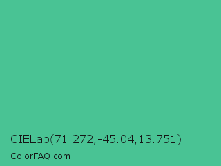 CIELab 71.272,-45.04,13.751 Color is a normal green color and the nearest color is Ocean Green #48bf91. Hex code #49c394 and RGB value is rgb(73,195,148). In RGB color space, this color is composed of 29% red, 76% green, 58% blue, In CMYK color space, this color is composed of 63% cyan, 0% magenta, 24% yellow , 24% black , In HSL color space, this color has a hue angle of 157° , 50% saturation and 53% lightness.