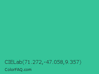 CIELab 71.272,-47.058,9.357 Color is a normal green color and the nearest color is Shamrock #33cc99. Hex code #33c49c and RGB value is rgb(51,196,156). In RGB color space, this color is composed of 20% red, 77% green, 61% blue, In CMYK color space, this color is composed of 74% cyan, 0% magenta, 20% yellow , 23% black , In HSL color space, this color has a hue angle of 163° , 59% saturation and 48% lightness.