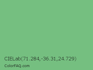 CIELab 71.284,-36.31,24.729 Color is a normal green color and the nearest color is Iguana Green #71bc78. Hex code #75bf80 and RGB value is rgb(117,191,128). In RGB color space, this color is composed of 46% red, 75% green, 50% blue, In CMYK color space, this color is composed of 39% cyan, 0% magenta, 33% yellow , 25% black , In HSL color space, this color has a hue angle of 129° , 37% saturation and 60% lightness.