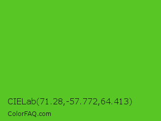CIELab 71.28,-57.772,64.413 Color is a normal green color and the nearest color is Kelly Green #4cbb17. Hex code #58c625 and RGB value is rgb(88,198,37). In RGB color space, this color is composed of 35% red, 78% green, 15% blue, In CMYK color space, this color is composed of 56% cyan, 0% magenta, 81% yellow , 22% black , In HSL color space, this color has a hue angle of 101° , 69% saturation and 46% lightness.