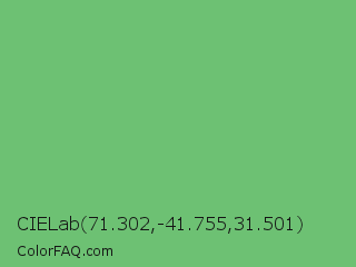 CIELab 71.302,-41.755,31.501 Color is a normal green color and the nearest color is Iguana Green #71bc78. Hex code #6dc173 and RGB value is rgb(109,193,115). In RGB color space, this color is composed of 43% red, 76% green, 45% blue, In CMYK color space, this color is composed of 44% cyan, 0% magenta, 40% yellow , 24% black , In HSL color space, this color has a hue angle of 124° , 40% saturation and 59% lightness.