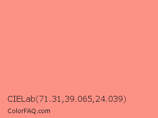 CIELab 71.31,39.065,24.039 Color is a light red color and the nearest color is Geraldine #fb8989. Hex code #fc9185 and RGB value is rgb(252,145,133). In RGB color space, this color is composed of 99% red, 57% green, 52% blue, In CMYK color space, this color is composed of 0% cyan, 42% magenta, 47% yellow , 1% black , In HSL color space, this color has a hue angle of 6° , 95% saturation and 75% lightness.