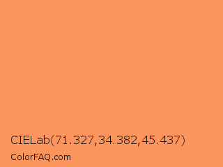 CIELab 71.327,34.382,45.437 Color is a light orange color and the nearest color is Tan Hide #fa9d5a. Hex code #fc945d and RGB value is rgb(252,148,93). In RGB color space, this color is composed of 99% red, 58% green, 36% blue, In CMYK color space, this color is composed of 0% cyan, 41% magenta, 63% yellow , 1% black , In HSL color space, this color has a hue angle of 21° , 96% saturation and 68% lightness.
