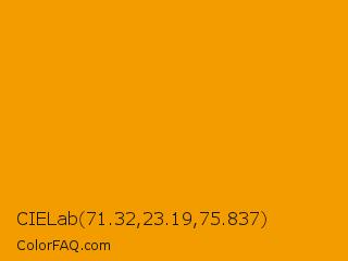 CIELab 71.32,23.19,75.837 Color is a normal orange color and the nearest color is Orange RYB #fb9902. Hex code #f29c00 and RGB value is rgb(242,156,0). In RGB color space, this color is composed of 95% red, 61% green, 0% blue, In CMYK color space, this color is composed of 0% cyan, 36% magenta, 100% yellow , 5% black , In HSL color space, this color has a hue angle of 39° , 100% saturation and 47% lightness.
