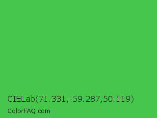 CIELab 71.331,-59.287,50.119 Color is a normal green color and the nearest color is Lime Green #32cd32. Hex code #46c74c and RGB value is rgb(70,199,76). In RGB color space, this color is composed of 27% red, 78% green, 30% blue, In CMYK color space, this color is composed of 65% cyan, 0% magenta, 62% yellow , 22% black , In HSL color space, this color has a hue angle of 123° , 54% saturation and 53% lightness.
