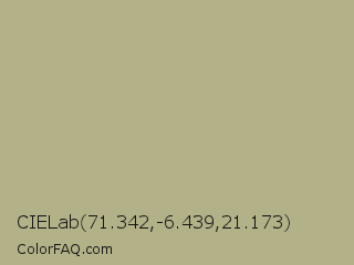 CIELab 71.342,-6.439,21.173 Color is a light yellow color and the nearest color is Swamp Green #acb78e. Hex code #b2b188 and RGB value is rgb(178,177,136). In RGB color space, this color is composed of 70% red, 69% green, 53% blue, In CMYK color space, this color is composed of 0% cyan, 1% magenta, 24% yellow , 30% black , In HSL color space, this color has a hue angle of 59° , 21% saturation and 62% lightness.