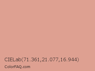 CIELab 71.361,21.077,16.944 Color is a light red color and the nearest color is Tonys Pink #e79f8c. Hex code #dea091 and RGB value is rgb(222,160,145). In RGB color space, this color is composed of 87% red, 63% green, 57% blue, In CMYK color space, this color is composed of 0% cyan, 28% magenta, 35% yellow , 13% black , In HSL color space, this color has a hue angle of 12° , 54% saturation and 72% lightness.