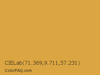 CIELab 71.369,9.711,57.231 Color is a normal orange color and the nearest color is Gold Metallic #d4af37. Hex code #dba642 and RGB value is rgb(219,166,66). In RGB color space, this color is composed of 86% red, 65% green, 26% blue, In CMYK color space, this color is composed of 0% cyan, 24% magenta, 70% yellow , 14% black , In HSL color space, this color has a hue angle of 39° , 68% saturation and 56% lightness.