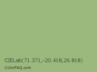 CIELab 71.371,-20.418,26.818 Color is a light green color and the nearest color is Olivine #9ab973. Hex code #9bb87d and RGB value is rgb(155,184,125). In RGB color space, this color is composed of 61% red, 72% green, 49% blue, In CMYK color space, this color is composed of 16% cyan, 0% magenta, 32% yellow , 28% black , In HSL color space, this color has a hue angle of 89° , 29% saturation and 61% lightness.