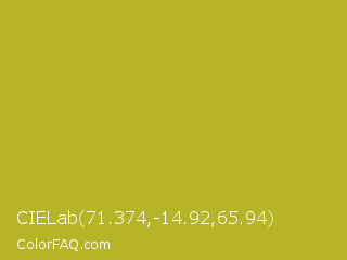CIELab 71.374,-14.92,65.94 Color is a normal yellow color and the nearest color is Acid Green #b0bf1a. Hex code #b6b427 and RGB value is rgb(182,180,39). In RGB color space, this color is composed of 71% red, 71% green, 15% blue, In CMYK color space, this color is composed of 0% cyan, 1% magenta, 79% yellow , 29% black , In HSL color space, this color has a hue angle of 59° , 65% saturation and 43% lightness.