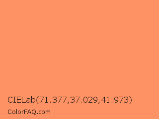 CIELab 71.377,37.029,41.973 Color is a light orange color and the nearest color is Atomic Tangerine #ff9966. Hex code #ff9264 and RGB value is rgb(255,146,100). In RGB color space, this color is composed of 100% red, 57% green, 39% blue, In CMYK color space, this color is composed of 0% cyan, 43% magenta, 61% yellow , 0% black , In HSL color space, this color has a hue angle of 18° , 100% saturation and 70% lightness.