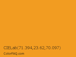 CIELab 71.394,23.62,70.097 Color is a normal orange color and the nearest color is Marigold #eaa221. Hex code #f29c21 and RGB value is rgb(242,156,33). In RGB color space, this color is composed of 95% red, 61% green, 13% blue, In CMYK color space, this color is composed of 0% cyan, 36% magenta, 86% yellow , 5% black , In HSL color space, this color has a hue angle of 35° , 89% saturation and 54% lightness.