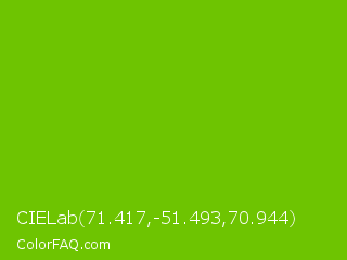 CIELab 71.417,-51.493,70.944 Color is a normal green color and the nearest color is Lima #76bd17. Hex code #6ec401 and RGB value is rgb(110,196,1). In RGB color space, this color is composed of 43% red, 77% green, 0% blue, In CMYK color space, this color is composed of 44% cyan, 0% magenta, 99% yellow , 23% black , In HSL color space, this color has a hue angle of 86° , 99% saturation and 39% lightness.