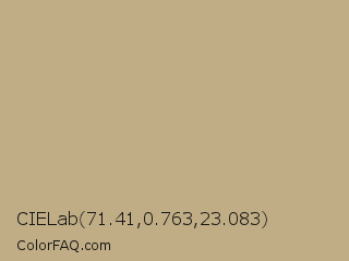 CIELab 71.41,0.763,23.083 Color is a light orange color and the nearest color is Sand Ecru #c2b280. Hex code #c0ad85 and RGB value is rgb(192,173,133). In RGB color space, this color is composed of 75% red, 68% green, 52% blue, In CMYK color space, this color is composed of 0% cyan, 10% magenta, 31% yellow , 25% black , In HSL color space, this color has a hue angle of 41° , 32% saturation and 64% lightness.