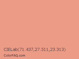 CIELab 71.437,27.511,23.313 Color is a light red color and the nearest color is Tonys Pink #e79f8c. Hex code #eb9b86 and RGB value is rgb(235,155,134). In RGB color space, this color is composed of 92% red, 61% green, 53% blue, In CMYK color space, this color is composed of 0% cyan, 34% magenta, 43% yellow , 8% black , In HSL color space, this color has a hue angle of 12° , 72% saturation and 72% lightness.
