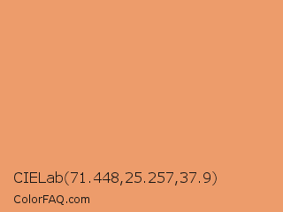 CIELab 71.448,25.257,37.9 Color is a light orange color and the nearest color is Apricot #eb9373. Hex code #ed9c6b and RGB value is rgb(237,156,107). In RGB color space, this color is composed of 93% red, 61% green, 42% blue, In CMYK color space, this color is composed of 0% cyan, 34% magenta, 55% yellow , 7% black , In HSL color space, this color has a hue angle of 23° , 78% saturation and 67% lightness.