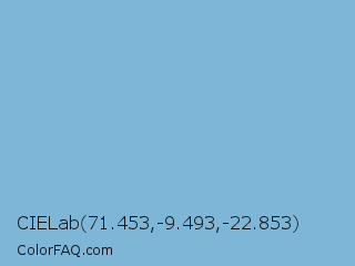 CIELab 71.453,-9.493,-22.853 Color is a light blue color and the nearest color is Dark Sky Blue #8cbed6. Hex code #7eb6d8 and RGB value is rgb(126,182,216). In RGB color space, this color is composed of 49% red, 71% green, 85% blue, In CMYK color space, this color is composed of 42% cyan, 16% magenta, 0% yellow , 15% black , In HSL color space, this color has a hue angle of 203° , 54% saturation and 67% lightness.