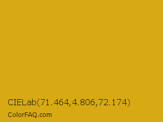 CIELab 71.464,4.806,72.174 Color is a normal yellow color and the nearest color is Galliano #dcb20c. Hex code #d7a912 and RGB value is rgb(215,169,18). In RGB color space, this color is composed of 84% red, 66% green, 7% blue, In CMYK color space, this color is composed of 0% cyan, 21% magenta, 92% yellow , 16% black , In HSL color space, this color has a hue angle of 46° , 85% saturation and 46% lightness.