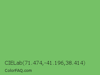 CIELab 71.474,-41.196,38.414 Color is a normal green color and the nearest color is Mantis #74c365. Hex code #75c166 and RGB value is rgb(117,193,102). In RGB color space, this color is composed of 46% red, 76% green, 40% blue, In CMYK color space, this color is composed of 39% cyan, 0% magenta, 47% yellow , 24% black , In HSL color space, this color has a hue angle of 110° , 42% saturation and 58% lightness.