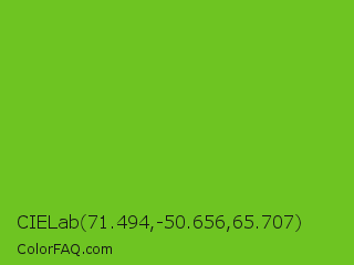 CIELab 71.494,-50.656,65.707 Color is a normal green color and the nearest color is Lima #76bd17. Hex code #6ec422 and RGB value is rgb(110,196,34). In RGB color space, this color is composed of 43% red, 77% green, 13% blue, In CMYK color space, this color is composed of 44% cyan, 0% magenta, 83% yellow , 23% black , In HSL color space, this color has a hue angle of 92° , 70% saturation and 45% lightness.