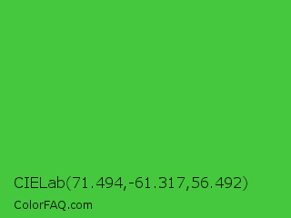 CIELab 71.494,-61.317,56.492 Color is a normal green color and the nearest color is Lime Green #32cd32. Hex code #45c83d and RGB value is rgb(69,200,61). In RGB color space, this color is composed of 27% red, 78% green, 24% blue, In CMYK color space, this color is composed of 66% cyan, 0% magenta, 70% yellow , 22% black , In HSL color space, this color has a hue angle of 117° , 56% saturation and 51% lightness.