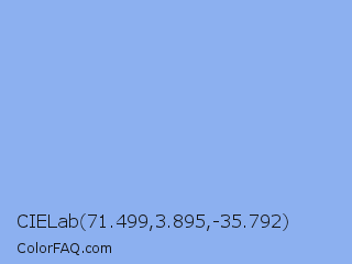 CIELab 71.499,3.895,-35.792 Color is a light blue color and the nearest color is Jordy Blue #8ab9f1. Hex code #8cb0f0 and RGB value is rgb(140,176,240). In RGB color space, this color is composed of 55% red, 69% green, 94% blue, In CMYK color space, this color is composed of 42% cyan, 27% magenta, 0% yellow , 6% black , In HSL color space, this color has a hue angle of 218° , 77% saturation and 75% lightness.