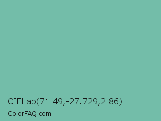 CIELab 71.49,-27.729,2.86 Color is a normal cyan color and the nearest color is Gulf Stream #80b3ae. Hex code #73bda9 and RGB value is rgb(115,189,169). In RGB color space, this color is composed of 45% red, 74% green, 66% blue, In CMYK color space, this color is composed of 39% cyan, 0% magenta, 11% yellow , 26% black , In HSL color space, this color has a hue angle of 164° , 36% saturation and 60% lightness.