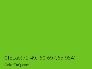 CIELab 71.49,-50.697,65.954 Color is a normal green color and the nearest color is Lima #76bd17. Hex code #6ec421 and RGB value is rgb(110,196,33). In RGB color space, this color is composed of 43% red, 77% green, 13% blue, In CMYK color space, this color is composed of 44% cyan, 0% magenta, 83% yellow , 23% black , In HSL color space, this color has a hue angle of 92° , 71% saturation and 45% lightness.