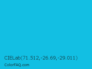 CIELab 71.512,-26.69,-29.011 Color is a normal cyan color and the nearest color is Cyan Process #00b7eb. Hex code #12bfe3 and RGB value is rgb(18,191,227). In RGB color space, this color is composed of 7% red, 75% green, 89% blue, In CMYK color space, this color is composed of 92% cyan, 16% magenta, 0% yellow , 11% black , In HSL color space, this color has a hue angle of 190° , 85% saturation and 48% lightness.