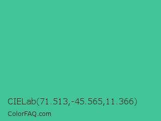 CIELab 71.513,-45.565,11.366 Color is a normal green color and the nearest color is Ocean Green #48bf91. Hex code #42c499 and RGB value is rgb(66,196,153). In RGB color space, this color is composed of 26% red, 77% green, 60% blue, In CMYK color space, this color is composed of 66% cyan, 0% magenta, 22% yellow , 23% black , In HSL color space, this color has a hue angle of 160° , 52% saturation and 51% lightness.